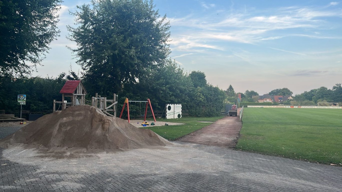 Der alte Boden wurde komplett abgetragen und durch robusten und wetterfesten Dolomitsand ersetzt. Zudem wurde ein neuer Weg zum Wiebusch hin geschaffen, und die unebene Fläche in den Wald hinein eingeebnet.