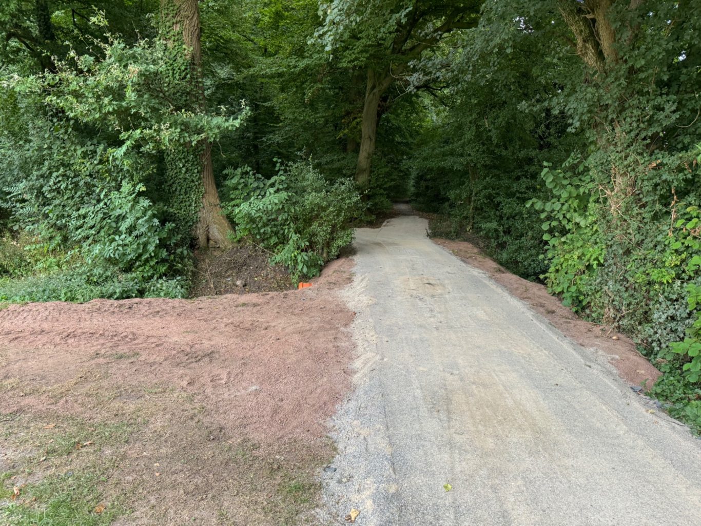 Der alte Boden wurde komplett abgetragen und durch robusten und wetterfesten Dolomitsand ersetzt. Zudem wurde ein neuer Weg zum Wiebusch hin geschaffen, und die unebene Fläche in den Wald hinein eingeebnet.